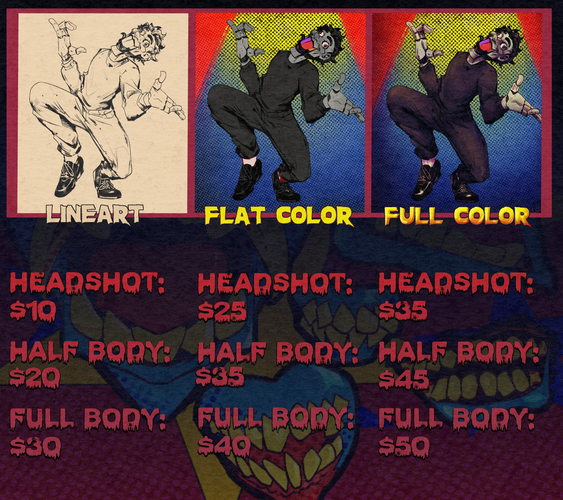 Regular commission prices are on the picture above!- Reference sheets are $75 and come with 2 full bodies (can be nude and one outfit or two outfits! ) They will be copied and pasted and then drawn over for more outfits!- For reference sheets and normal commissions! I will add extra stuff on the side for $5 each! (Ex. You wanted two different weapons, which would be $5 per weapon)- For extra characters, it's just the same price as normal commissions added on. (Ex: you wanted two characters in one painting as full bodies, it'd be the price of two full bodies)- Custom Characters are $55 and come with one full body!